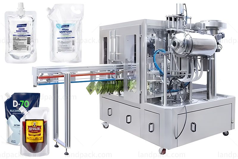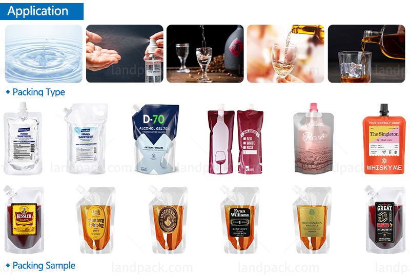 This filling capping machine, it is suitable for spout pouches and stand-up pouches for various liquid products, such as alcohol, liquor, juice, laundry detergent, sauce, jelly, baby puree, baby friut, butter, paste, chemical liquid, etc.