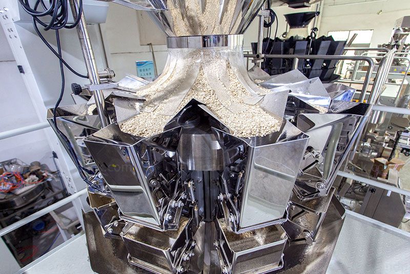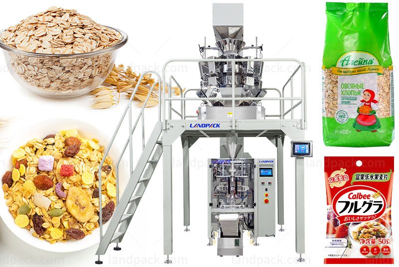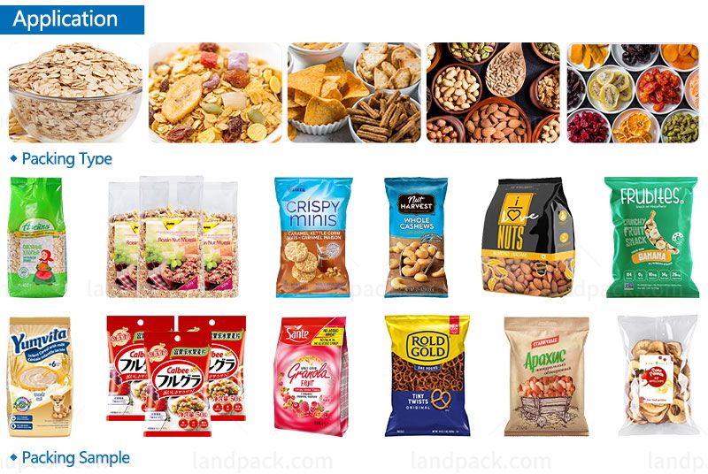 Apply to pack bulk grain, slice, short bar material products such as oatmeal, cereal oats, puffy food, popcorn, shrimp chip, salt, sugar, rice, sunflower seed, peanut, beans, nuts, pistachio, peas, etc.