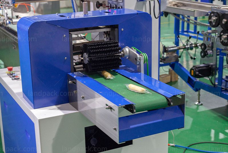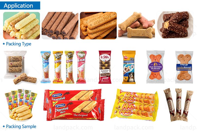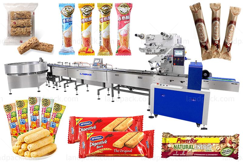 The feeding and packaging line is suitable for packaging non-breakable items, such as biscuit, snack bars, candy, marshmallows, puffed corn sticks, energy bars, oat bars, cheese bars, etc.