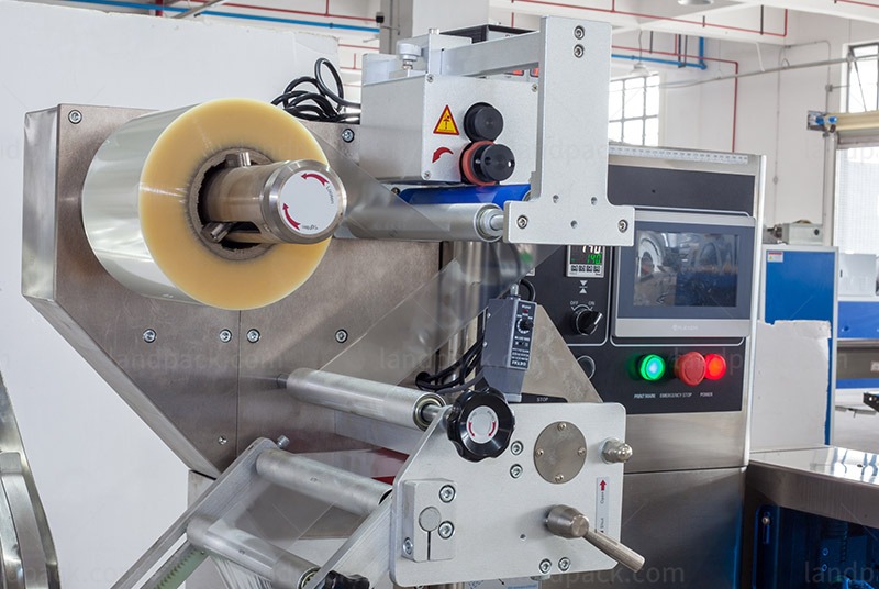 * Film Feeding: A roll of packaging film is loaded on top. The film is pulled down smoothly through film feeding rollers to ensure it stays flat and aligned.