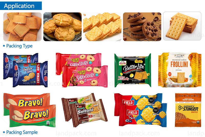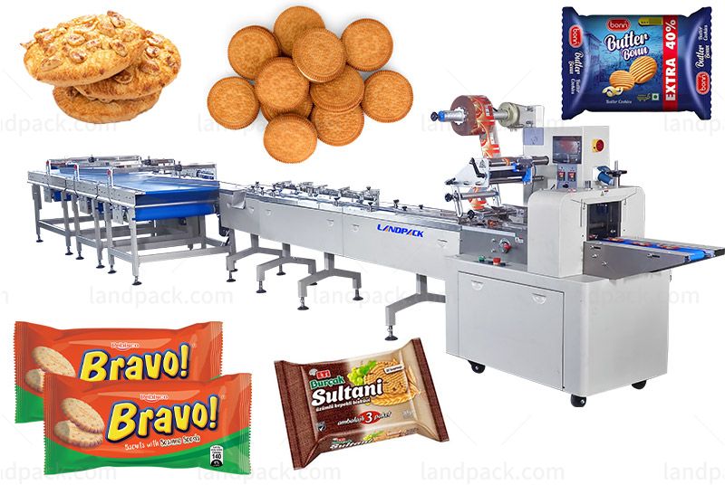 This feeding wrapping machine line is suitable for pillow packing of This machine is ideal for packaging a wide range of bakery products, including biscuits, cookies, crackers, and sandwich biscuits. It is suitable for products of different shapes and sizes, ensuring efficient, high-speed packaging for various baked goods, such as chocolate bars, wafers, cakes, and other snacks..