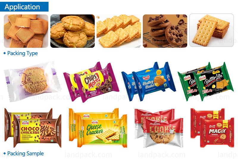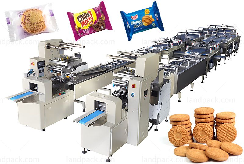 The automatic feeding packaging line can sort, arrange, automatically distribute, and load the packaging materials. Applicable to high-speed packaging of a variety of materials, such as biscuit, cookies, bun, hamburger bun, rusk, bread, cake, dry food, candy, snack, chocolate, jerky, etc.