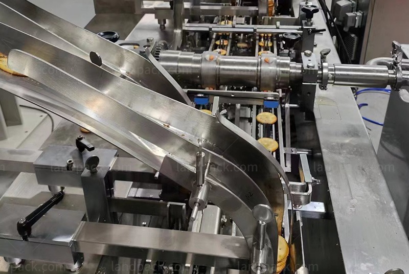 4. Biscuit On Edge – The finished sandwich biscuits are gently turned to stand on edge for stable alignment and smooth packaging.