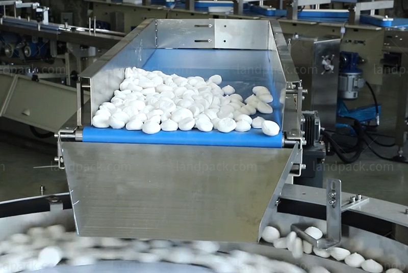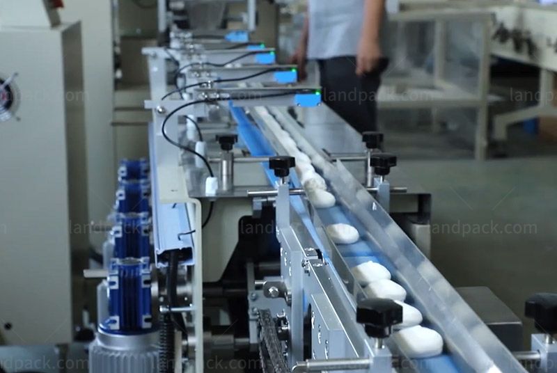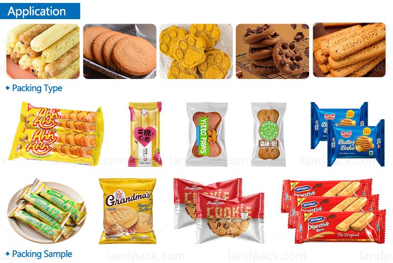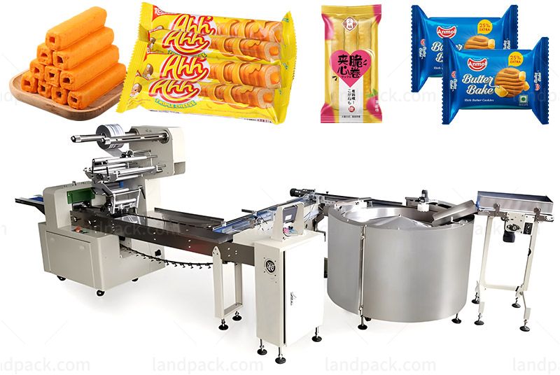 The feeding and packaging line is suitable for packaging non-breakable items, such as biscuit, snack bars, candy, marshmallows, puffed corn sticks, energy bars, oat bars, cheese bars, etc.