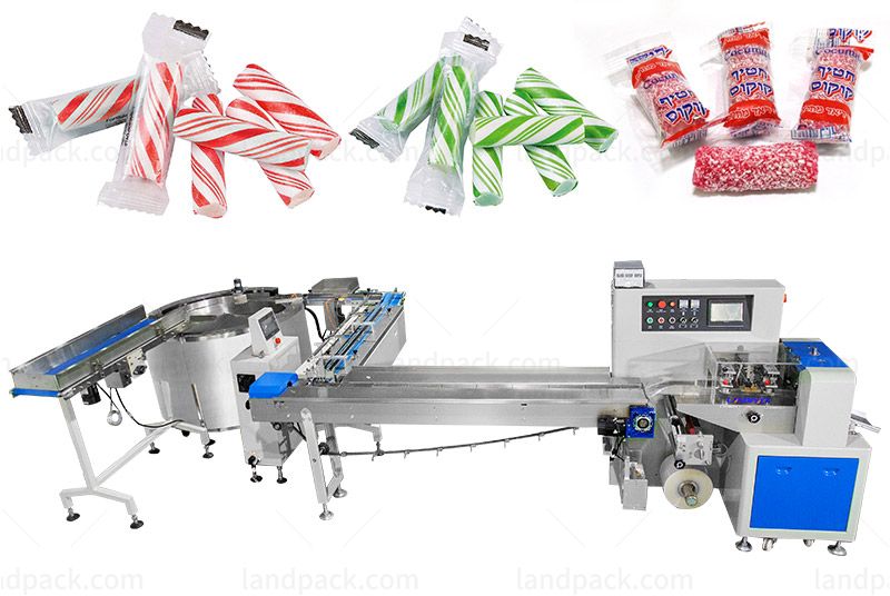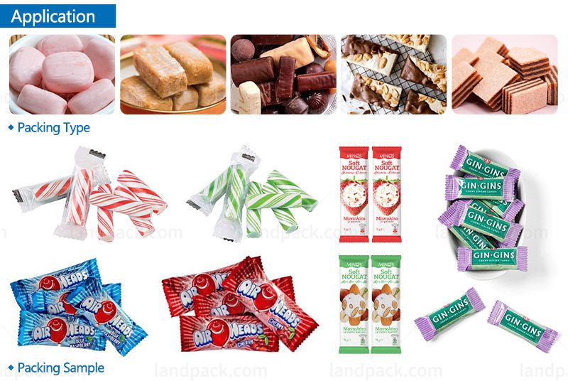 This feeding wrapping packaging machine line focuses on pillow packing of kinds of candy such as hard candy, gummy bears, jelly beans, sour candy, chewing gum, peanut brittle, bubble gum, marshmallows, etc.