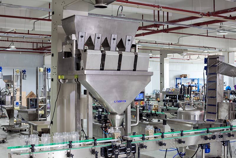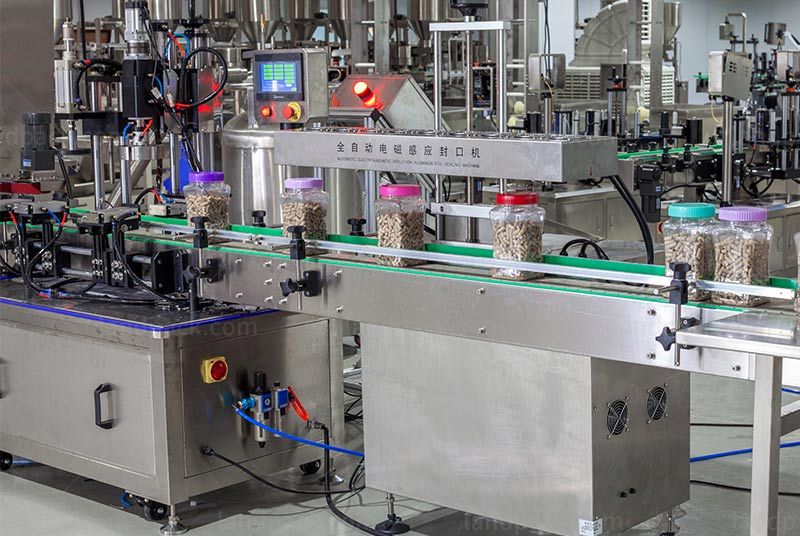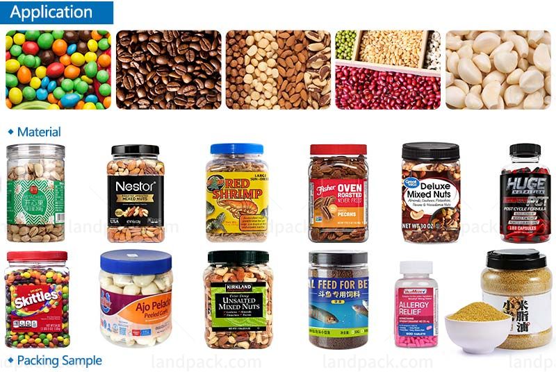 Automatic Candy Bottles Weighing Filling Capping and Labeling Line, it is Scope of application: granular and solid materials such as nuts, beans, peanuts, snacks, cashew, sugar, rice, beans, condiments, washing powder, feed, desiccant, plastic pellets, grains, etc.