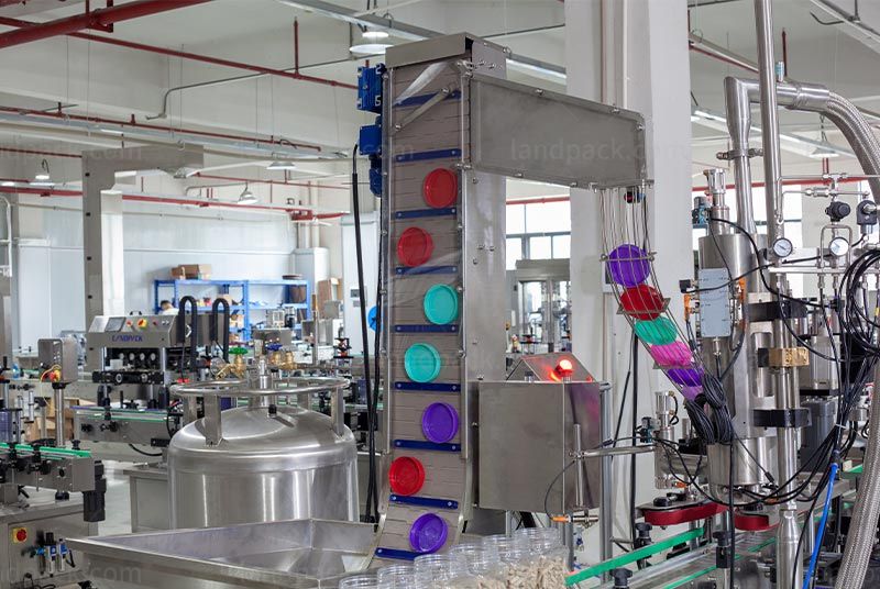 2. This line uses automatic bottle feeding, linear scale filling machine, four-wheel capping machine, wafer positioning round bottle labeling machine, and collection platform to form a fully automated production line;