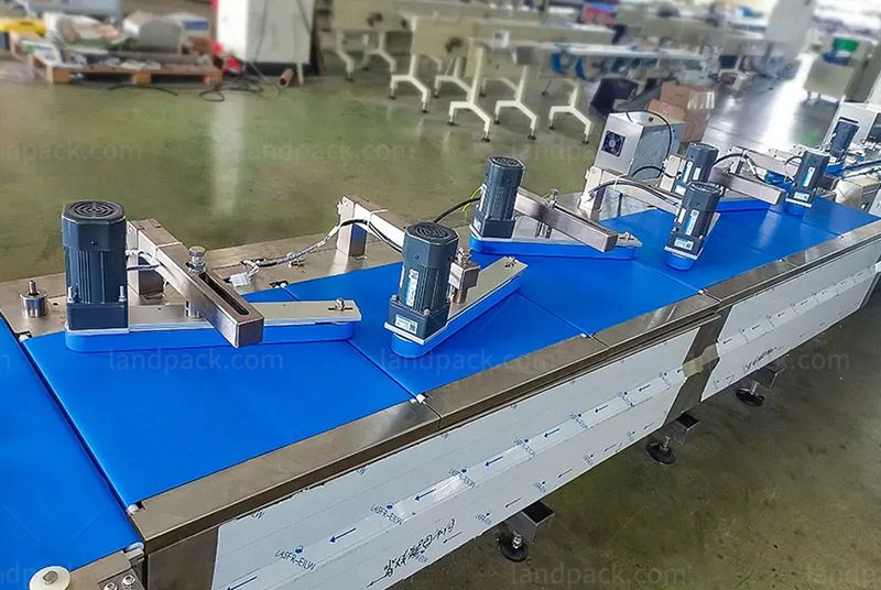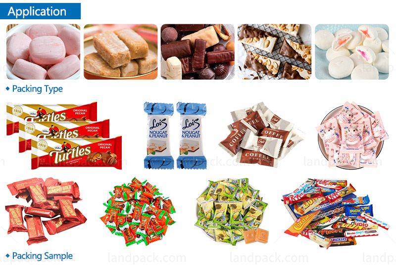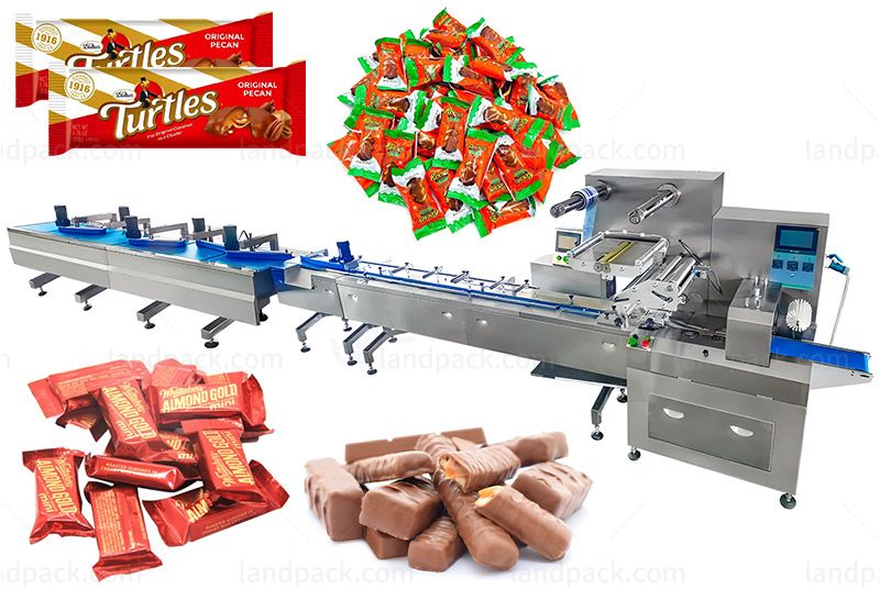 This is a feeding packing line that supports various shapes of candy, toffee, chocolate candy, caramel, marshmallow, and gummy with material collation/ inspection/ rejection/ bagging functions.