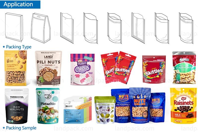 This machine is full automatic workflow, pouch delivery, date printing, pouch opening, filing, sealing, product completion. Suitable for liquid, powder, solid, and other products packaging.