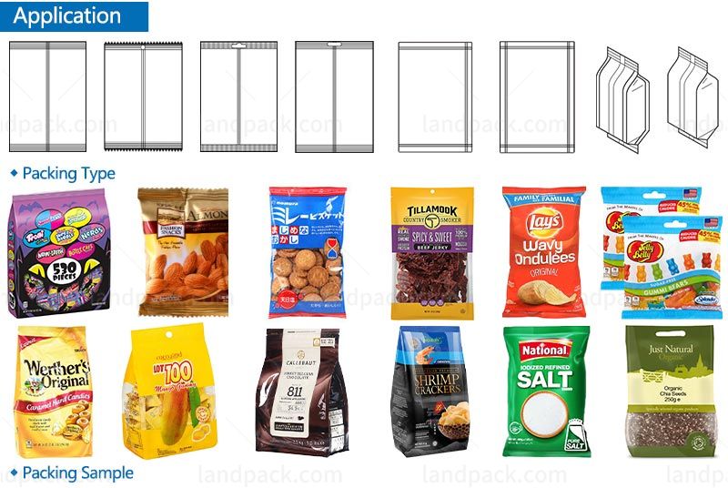 Suitable for packing all kinds of grain material, sheet material, strip material and abnormity material which such as candy, sunflower seeds, peanut, nuts, beans, potato chips, popcorn, almond, dry fruit, vegetable salad (shreded or sllices vegetables, like iceberg lettuce, cabbage, romain, spring onion and leek ect.), frozen food, jelly, biscuit, chocolate, filbert, corn, pet food, dilatant foodstuff, hardware and plastic can be weighed by the ration.