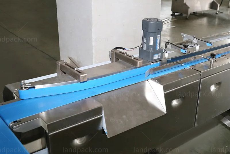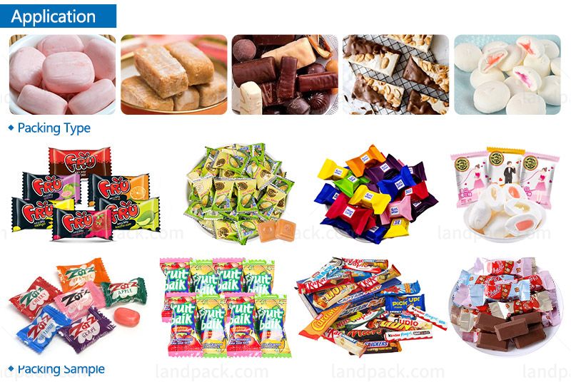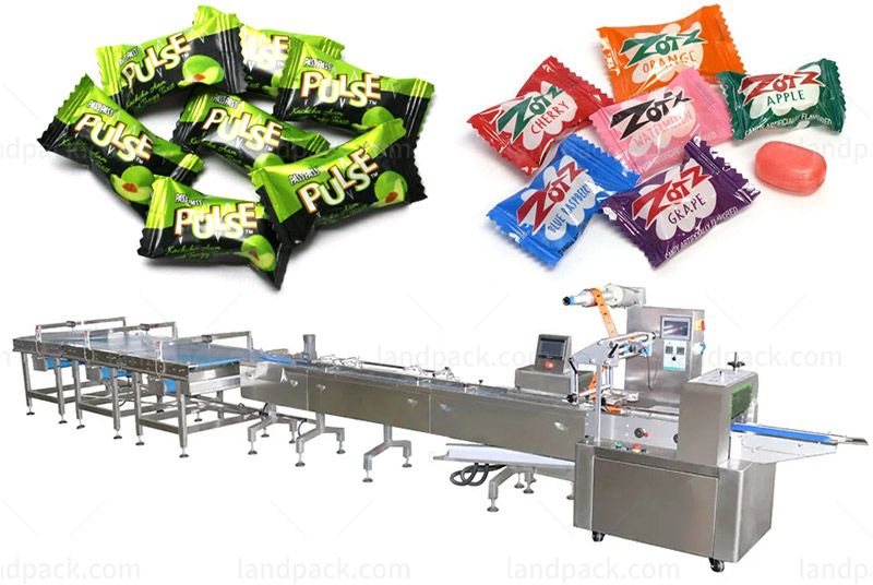 This feeding wrapping packing line, equipped with a simple automatic feeding line and chain packaging machine, is suitable for packaging candy, toffee, caramel, marshmallow, gummy, jelly, etc.