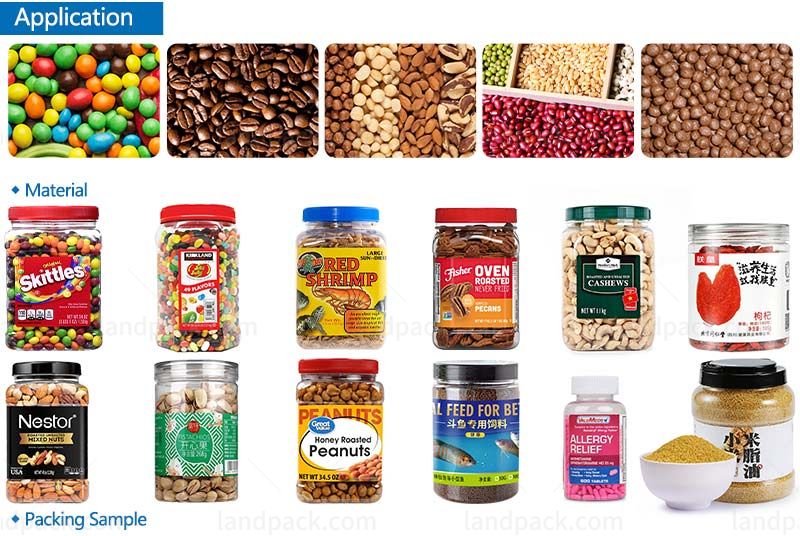 Automatic Granule Weighing Filling Capping and Labeling Line(LFZX-SC-10), it is Scope of application: granular and solid materials such as nuts, beans, peanuts, snacks, cashew, sugar, rice, beans, condiments, washing powder, feed, desiccant, plastic pellets, grains, etc.