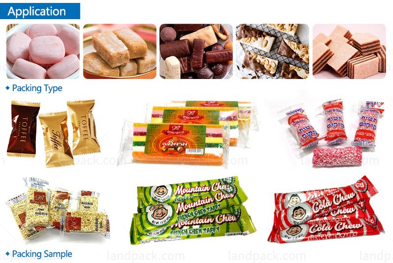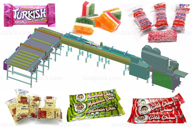 This feeding wrapping packing line, equipped with a simple automatic feeding line and chain packaging machine, is suitable for packaging candy, chocolate candy, toffee, caramel, marshmallow, gummy, jelly, etc.