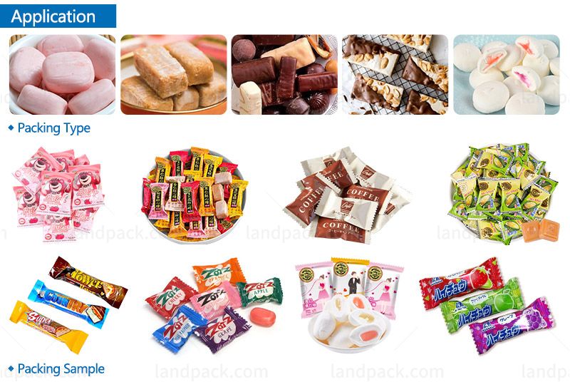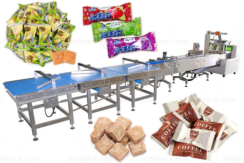 This feeding and packing machine line is designed for packaging rectangular, square, round, oval, and special-shaped candies into pillow bag