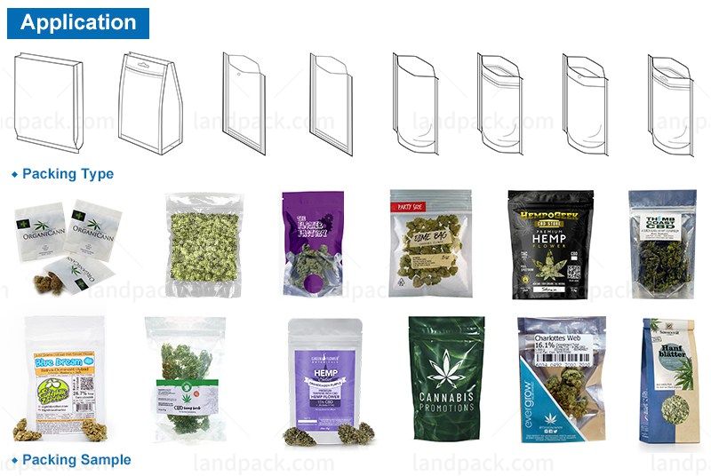 Application: Suitable for various granlue material in doypack pouch style, such as marijuana, cannabis, beans, nuts, dry fruits, candy, cereal, chocolate, biscuit, peanut, capsule, seeds, chemicals, sugar, etc.