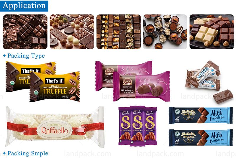 This machine is designed for packing fixed shaped materials into pillow packages, suitable for packing all kinds of regular shaped solid products, including foodstuff, such as chocolate, breads, moon cakes, candies etc, commodities, industrial parts etc.