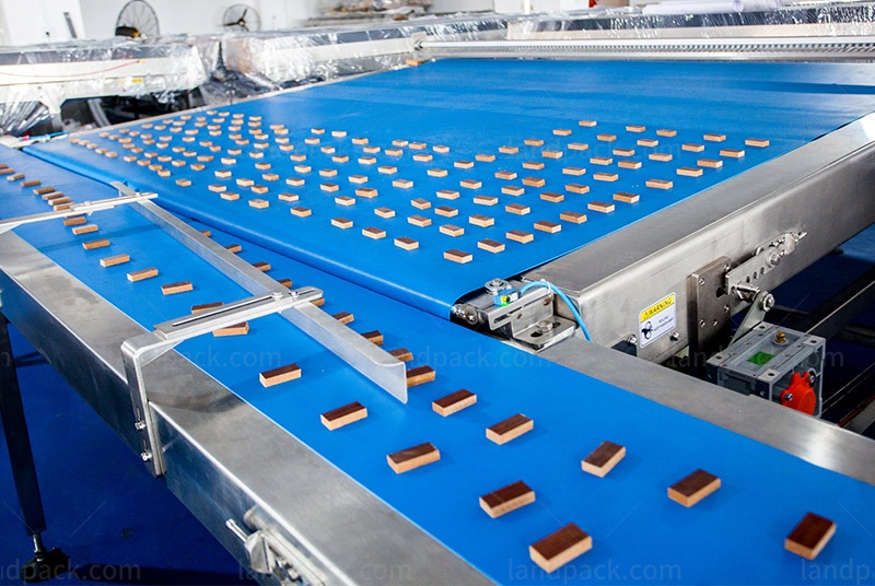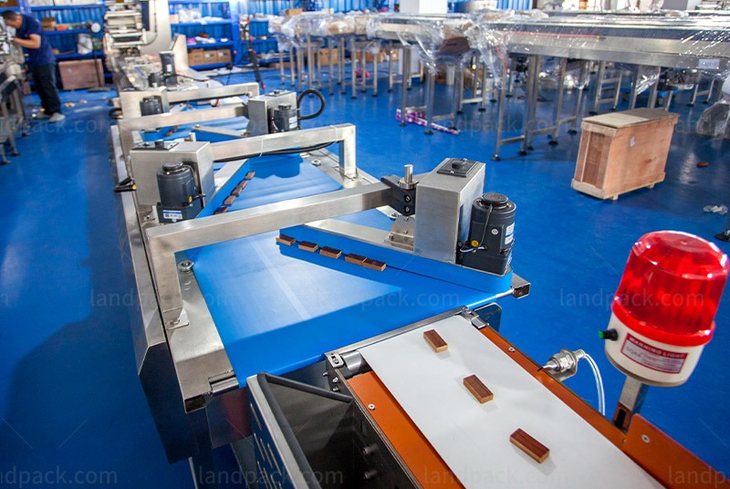 * Horizontal Conveyor Belt – Feeds and arranges chocolate bars for further processing.