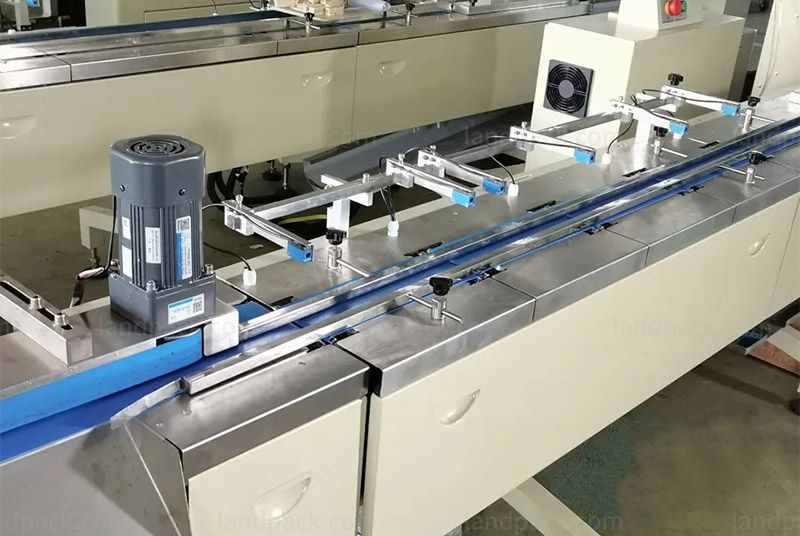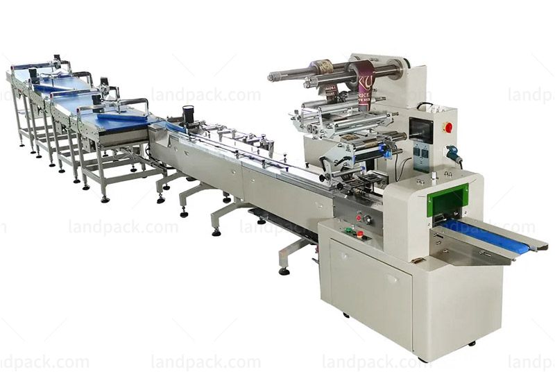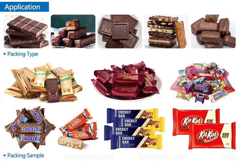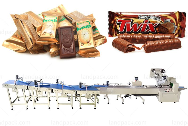 This line is designed for automatically conveying, arranging, feeding, and packing square, round, or strip-shaped products like chocolate and energy bars, neatly moving them from front-end production equipment onto the conveyor belt.