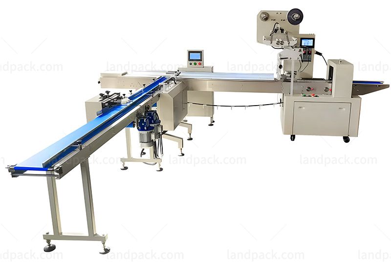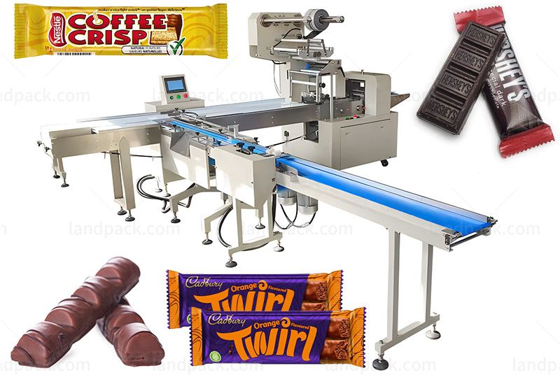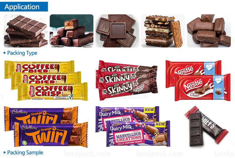 Suitable for automatic feeding, aligning, distributing and packing without workers and widely used in the food industry which product's shape is round, square, or bar such as mini chocolate bars, granola bars, energy bars, filled chocolate bars, almond chocolate bars, milk chocolate bars, etc.