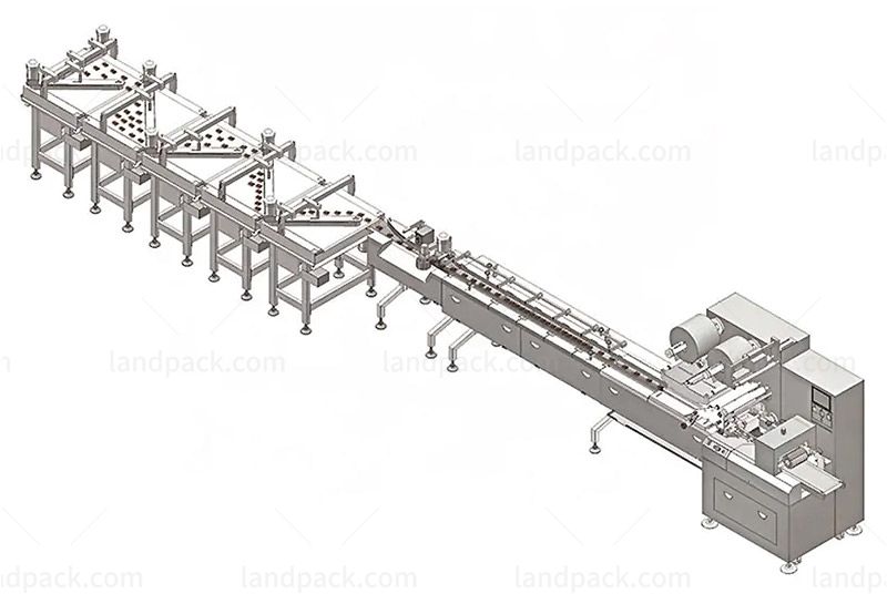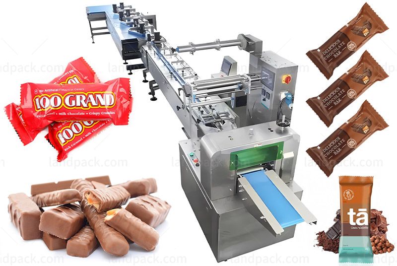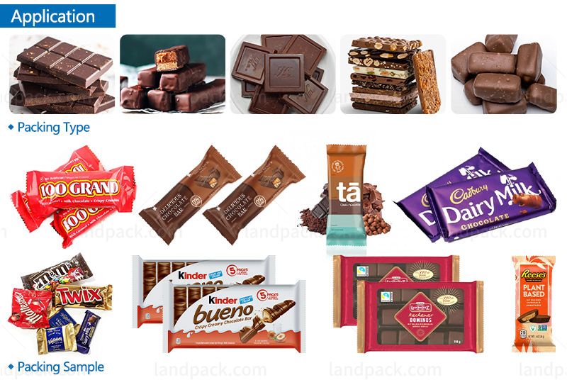 This is a chocolate bar feeding packing line that supports various shapes of chocolate bars, snack bars, biscuit with material collation/ inspection/ rejection/ bagging functions.