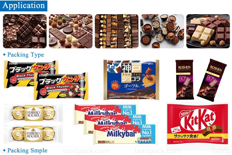 The machine is suitable for packing for the chocolate , candy , cereal bar such small size and need high speed packing request . The packing line can base on the products size adopt four /three/ two/ one pair cutter to meet the speed request .