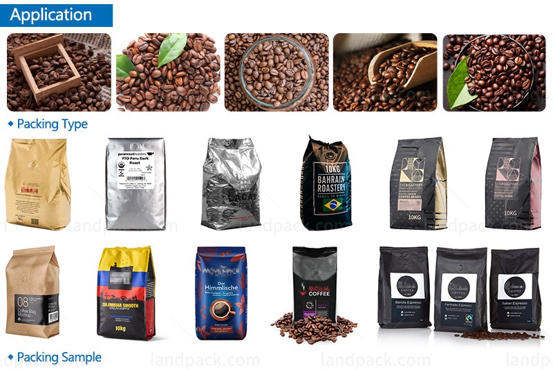 The packaging machine supports multiple bag types including pillow bags, gusset bags, quad seal bags, and back sealing bags. It is compatible with laminated films such as PET/PE, OPP/CPP, and aluminum foil structures.