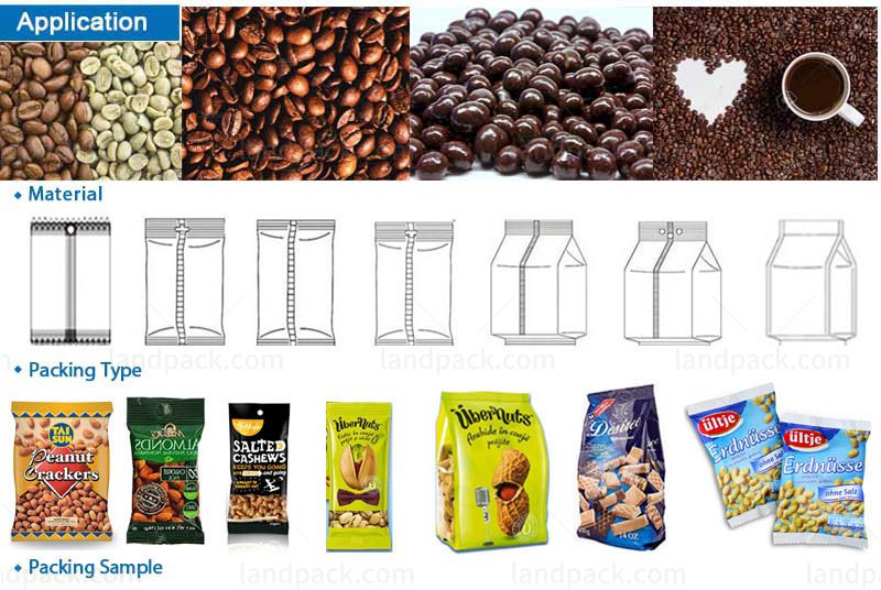 Suitable for packing all kinds of grain material, sheet material, strip material and abnormity material which such as Coffee Beans, nuts, sunflower seeds, peanut, almond, potato chips, popcorn, candy, dry fruit, vegetable salad (shreded or sllices vegetables, like iceberg lettuce, cabbage etc.