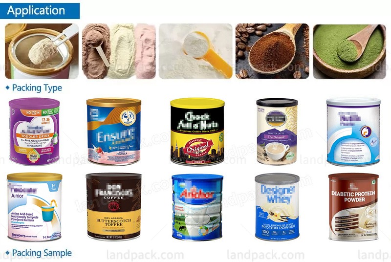 This powder filling line is suitable for coffee powder, milk powder, protein powder, health powder, medical powder, nutrition powder, monosodium glutamate, solid beverage, icing sugar, dextrose, feed, solid medicament, powdery additive, etc.