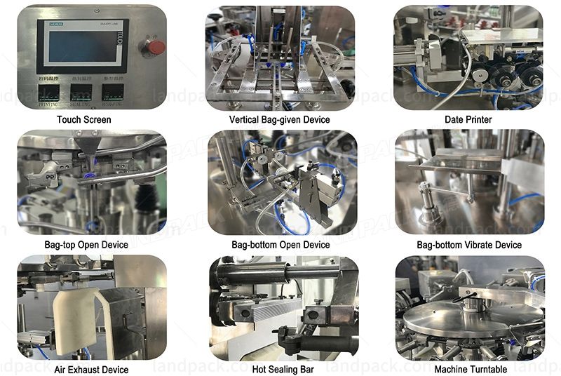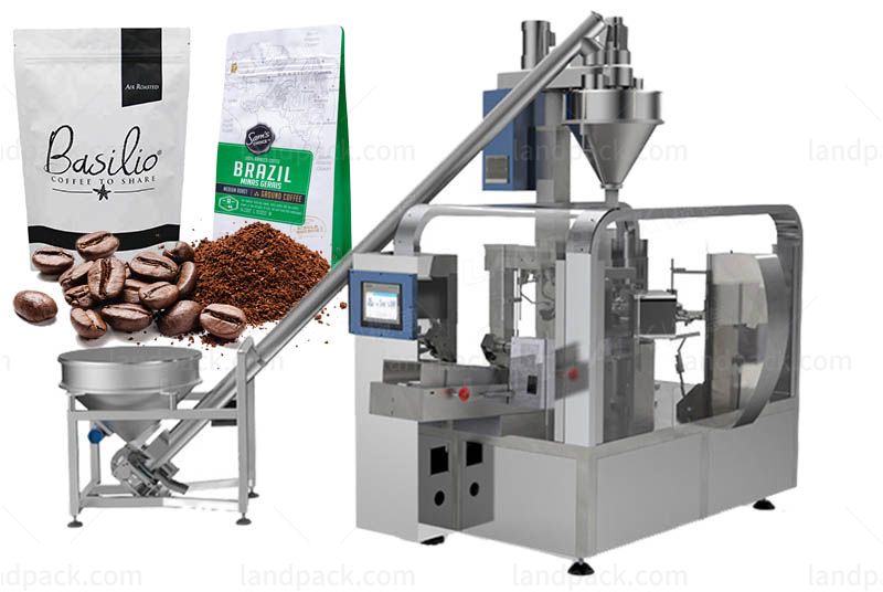 Full automatic intermittent rotary preformed bags dispensing, opening and closing machine combined with automatic auger powder filler, bulk screw feeder and product bulk hopper.