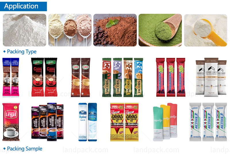 This coffee powder packing machine produces sticks/sachets for coffee packaging. It supports different stick widths and lengths, making it easy to adjust for various serving sizes and packaging styles.