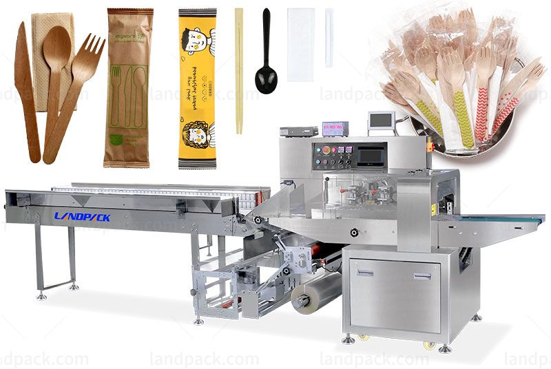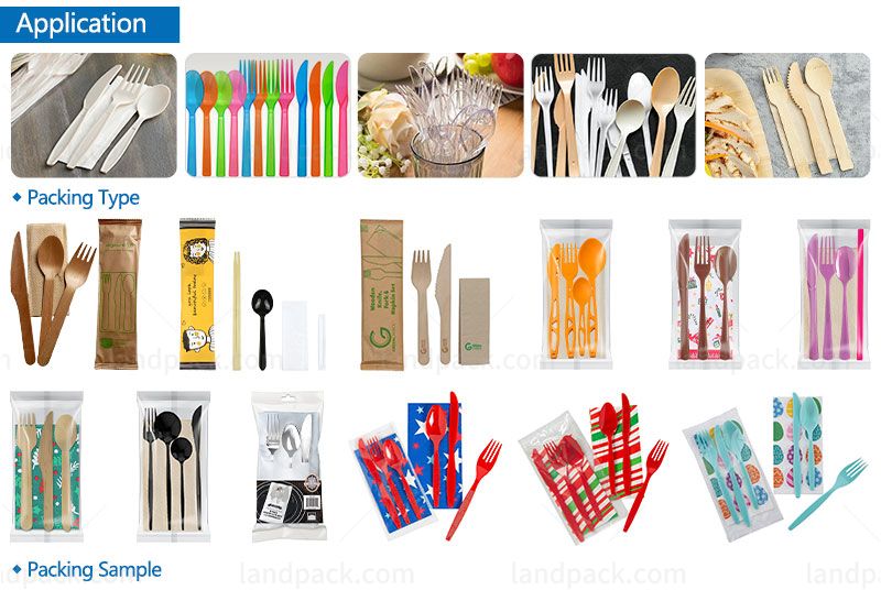 This packaging machine is suitable for packing disposable plastic cutlery sets, such as napkin, fork, knife, spoon, toothpick in a bag. It is widely used in hotels, airlines, and the fast-food industry.
