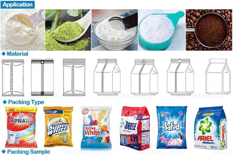 Suitable for automatic packaging of various kinds of powder, such as detergent powder, coffee powder, chili powder, spices, sugar, soap powder, curry powder, feed etc.