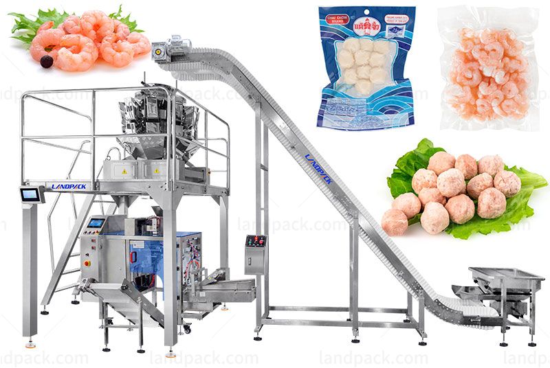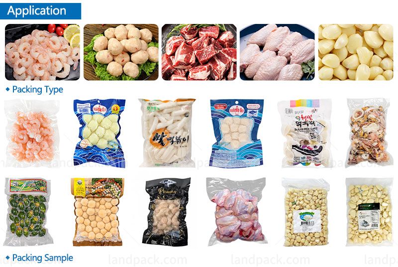 Automatic frozen food shrimp meatball vacuum pouch doypack packing machine is suitable for vacuum packing shrimp, meatballs, hotpot balls, fish balls, cuttlefish balls, and other frozen foods that require vacuum packaging.