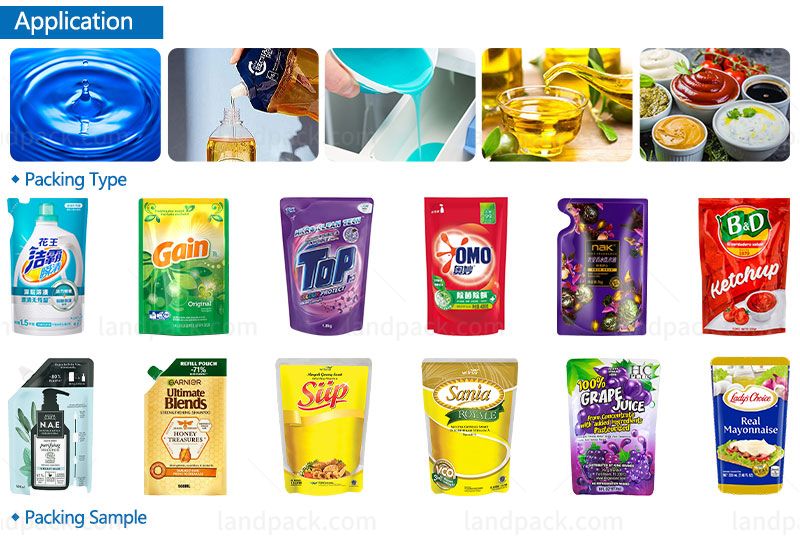 It can adopt all type of heat sealable performed side seal bags, block bottom, bags, zip-lock recloseable bags, stand-up pouch with or without spout, paper bags, flat pouch, stand-up pouch, zipper pouch, spout pouch, m gusset pouch, paper pouch, aluminium foil pouch, etc