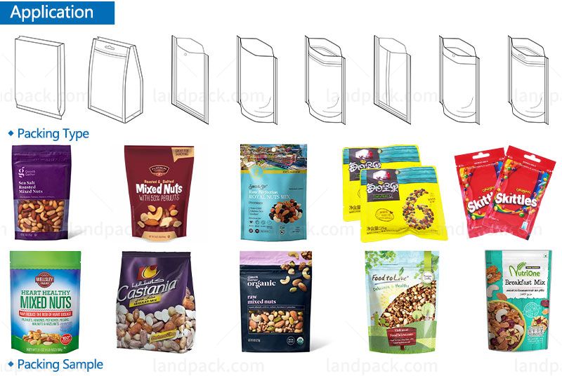 | Bag type | All type of heat sealable preformed side seal bags, gusseted bags, block bottom bags,zip-lock recloseable bags, stand-up pouch with or without spout etc. |
