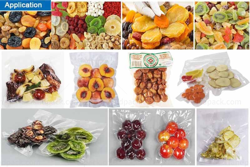 Any product suitable for vacuum packaging | 1. Solid species: candy, peanut, green bean, pistachio, crystal candy, brown sugar, cookie, cake, daily commodities, cooked food, pickles, puffed food, etc. 2. Granule species: grain, refined monosodium glutamate, granular drug, capsule, seed, condiment, granulated sugar, chicken essence, melon seeds, nuts, pesticide, fertilizer, feed etc.3. Liquid species: detergent, fruit juice, miller wine, soy sauce, vinegar, drinks etc. 4. Thick liquid species: chilli sauce, tomato sauce, peanut butter, jam, bean sauce etc. 5. Materials that can pack in bag |