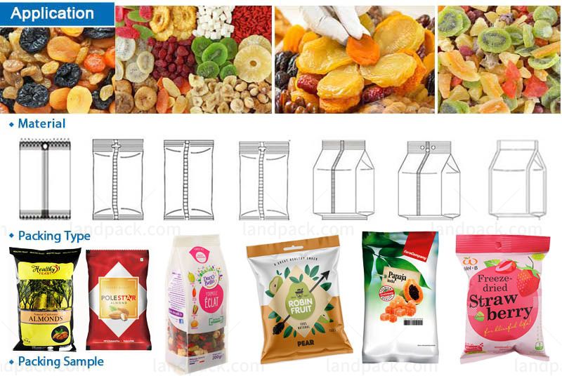 Suitable for packing all kinds of grain material, sheet material, strip material and abnormity material which such as Dry Fruit, candy, sunflower seeds, peanut, nuts, beans, potato chips, popcorn, almond, vegetable salad (shreded or sllices vegetables, like iceberg lettuce, cabbage, romain, spring onion and leek ect.), frozen food, jelly, biscuit, chocolate, filbert, corn, pet food, dilatant foodstuff, hardware and plastic can be weighed by the ration.
