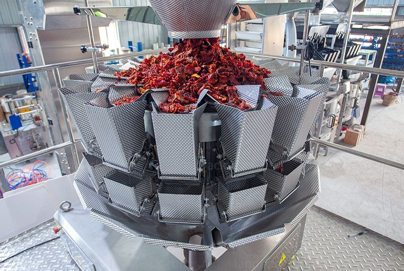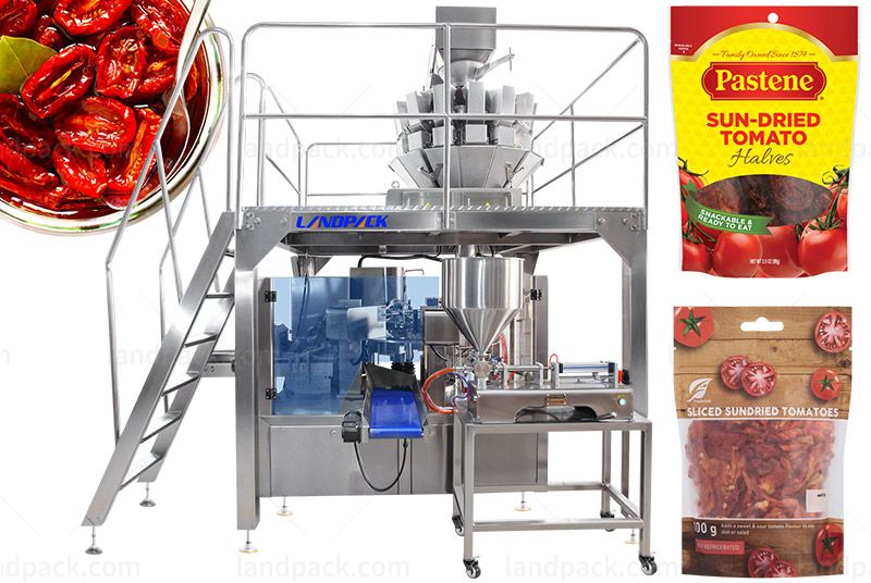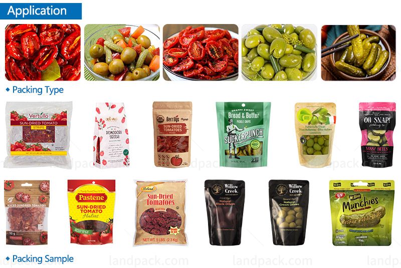 Suitable for automatic packing of grain and solid food, such as dry tomatoes, dry fruits, nuts, beans, candy, cereal, chocolate, biscuits, peanuts, capsules, seeds, etc. Different kinds of products with stand-up pouches, doypack with zippers, 3-side seal bags, 4-side seal bags, flat bags, etc.