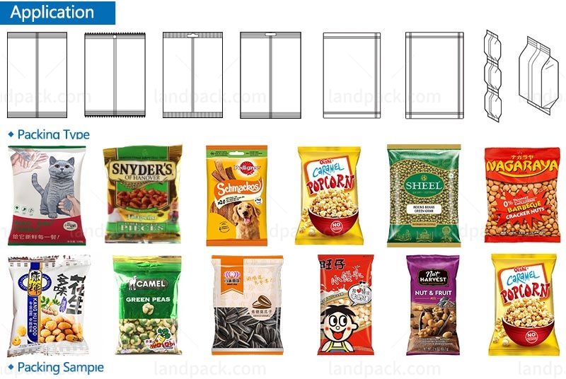 Suitable for packing all kinds of grain material, which such as dry food, small biscuits, popcorn, seeds, beans, peanuts, cashew nut, sugar and salt, millet, rice, pill, peas, lentil, moong dal, soybean, wheat, sesame, pumpkin seeds, hazelnut, etc.