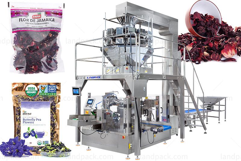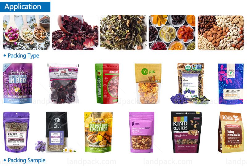 This machine is perfect for the automatic packing of grains and solid foods, including dry flowers, dry chili, dry tomatoes, dry fruits, nuts, beans, candy, cereal, chocolate, biscuits, peanuts, capsules, and seeds.
