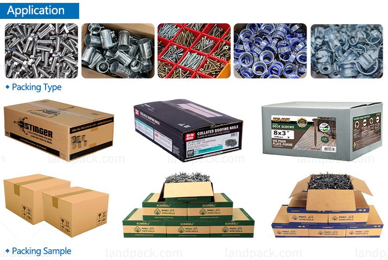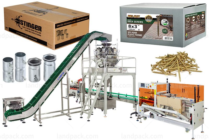 Suitable for carton box packing of various hardware, fasteners, and auto parts. Landpack's fastener packaging machine shares a set of loading and weighing systems, saving both cost and space.