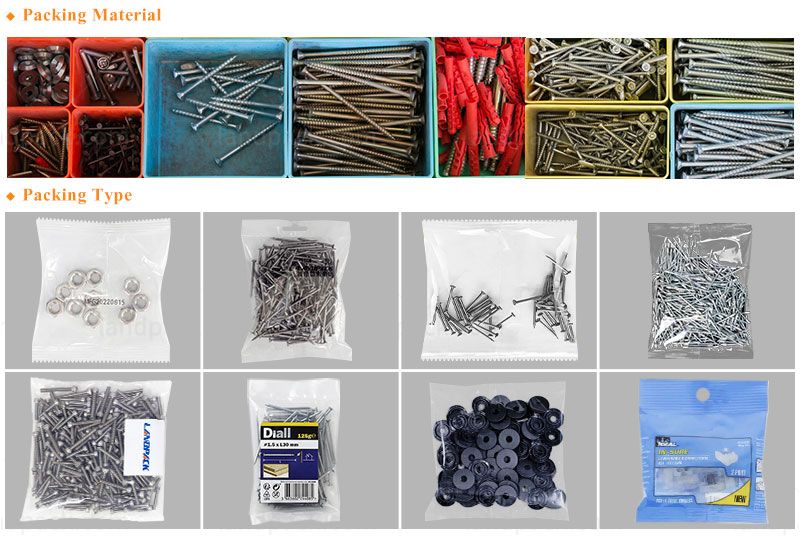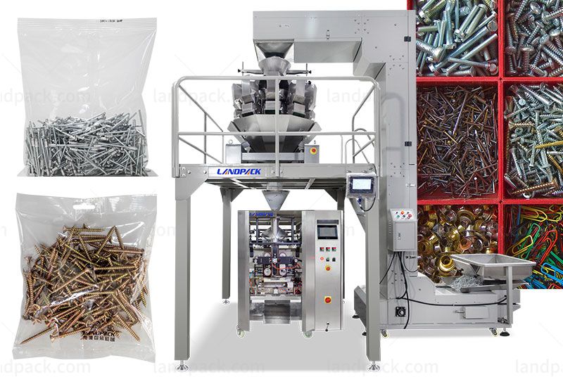 This packaging solution is suitable for large production packaging. Economical, save costs. suitable for weighing screws, nut bolts, washers, furniture kits, hardware parts, fasteners, and small parts into pouches.