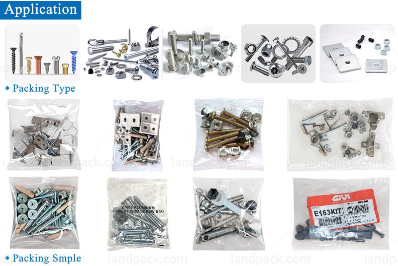 This automatic counting and packing machine is ideal for a range of hardware and small parts, including fasteners, hinges, screws, nails, bolts, nuts, gaskets, bearings, glass parts, plastic parts, furniture and toy accessories, blind nuts, and various other components. It ensures efficient and accurate counting and packing for diverse industrial applications.