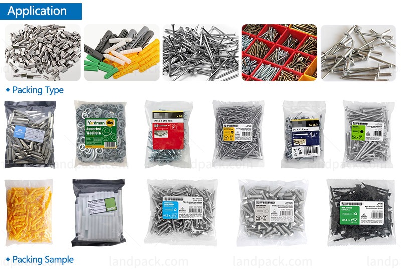This machine supports multiple bag styles, including back sealing bags, pillow bags, gusset bags, and flat bags, providing flexible packaging options for different fastener quantities and display needs.