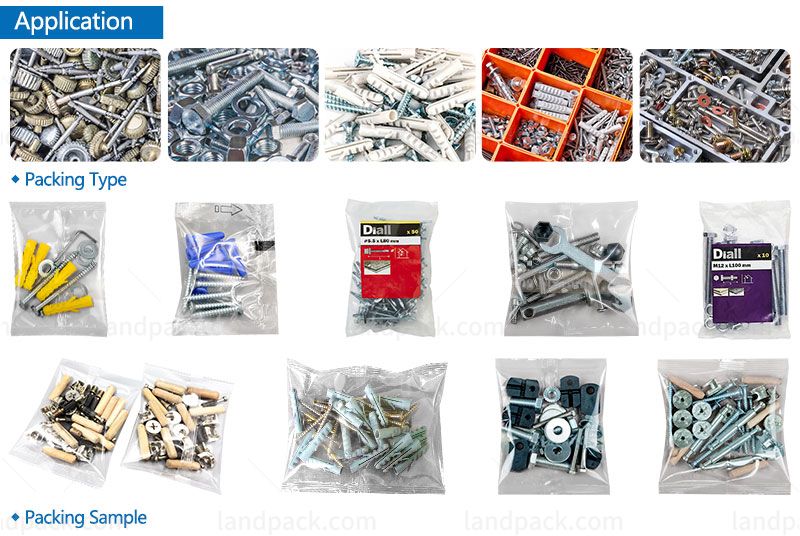 This weighing and counting packing machine is suitable for various hardware parts and plastic parts. For example hardware parts, nuts, bearings, bolts, plastic parts, screws, fasteners, bearings, etc.