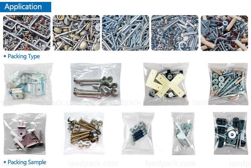 This weighing and counting packing machine is suitable for various hardware parts and plastic parts. For example hardware parts, nuts, bearings, bolts, plastic parts, screws, fasteners, bearings, etc.