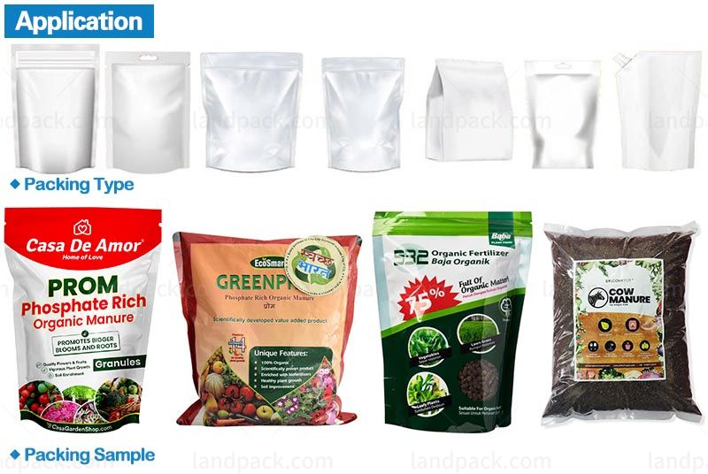 Suitable for various granlue material in premade pouch style, such as fertilizer, organic fertilizer, beans, nuts, dry fruits, candy, cereal, chocolate, biscuit, peanut, capsule, seeds, chemicals, sugar, etc.