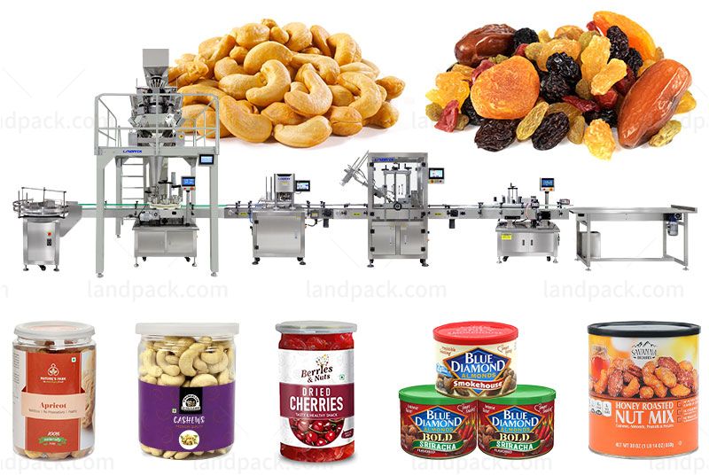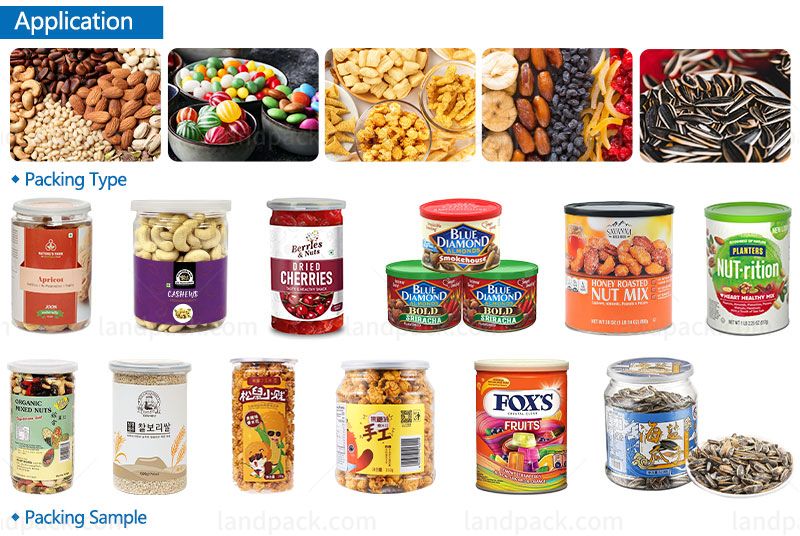 This guanules caning filling line is suitable for packaging various granular products, such as pet food, nuts, rice, corn flakes, peanuts, snack, popcorn, dry fruits, candy, melon seeds, pepper, oatmeal, etc. Suitable for all kinds of containers on the market, such as plastic cans, bottles, jars, etc.