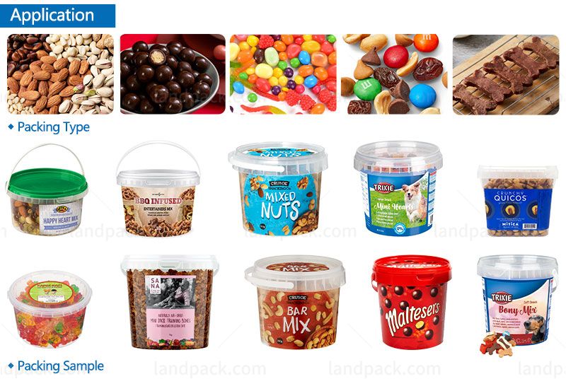 Suitable for automatic bottling filling capping of various granular products. such as nuts, beans, peanuts, candy, sunflower seeds, potato chips, popcorn, almonds, dry fruit, vegetable salad, frozen food, jelly, biscuits, chocolate, filbert, corn, pet food, etc.