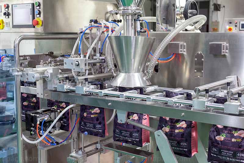 Full automatic intermittent rotary preformed bags dispensing, opening and closing machine combined with automatic auger powder filler, bulk screw feeder and product bulk hopper.